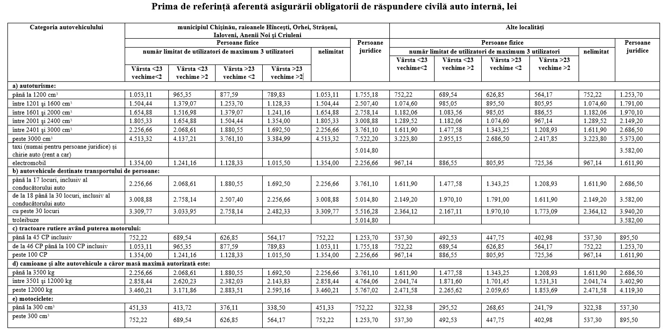 Asadar, fara toate aceste date legate de autovehicul si sofer nu se poate vorbi despre un pret exact. Cu toate acestea, Banca Națională a Moldovei (BNM) a stabilit un pret de referinta pentru asigurarile RCA, astfel ca putem sa ne facem o idee despre cat ar trebui sa platim pentru o polita in functie de autoturismul pe care il conducem, varsta si vechimea in condus.